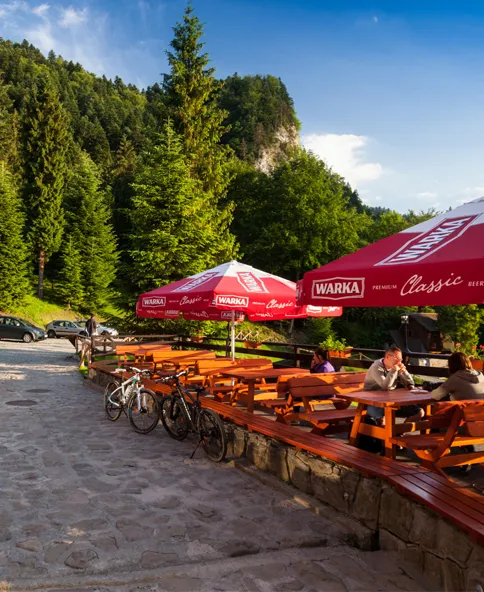 Goście Pijalni Piwa w Szczawnicy w słoneczne dni mogą raczyć się złocistym napitkiem na zewnątrz, zajmując miejsce przy jednym z wielu wystawionych stołów. Musimy przyznać, że piwo smakuje wyśmienicie w połączeniu ze świeżym górskim powietrzem, gdy oko dodatkowo cieszy widok na majestatyczne górskie szczyty.
